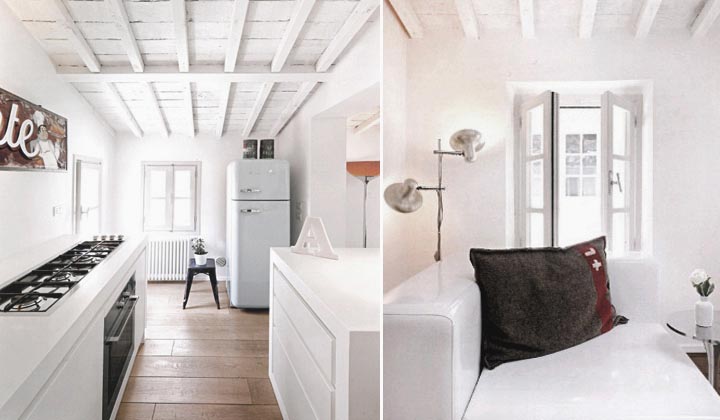 Un edificio del 18° secolo completamente ristrutturato ha portato alla luce questo splendido loft total white impreziosito e reso unico da una serie di oggetti vintage sparsi in tutta la casa. Equilibrio perfetto tra antico e moderno.